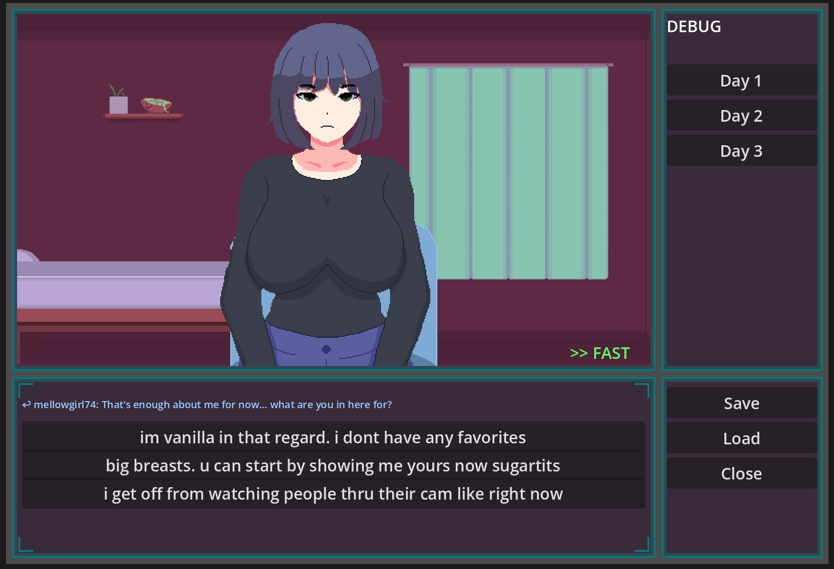 Deviant Watch is a slow-burn adult visual novel told entirely through a chat interface. No grand adventure. No combat. Just two strangers, a screen between them, and a week to see how far things go.